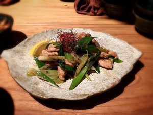 鶏と九条ネギの炒め物。シャッキリとした九条ネギの食感が鶏肉に合う。