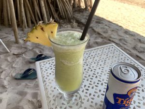 いいっすねー。部屋から出て数秒でビーチ、太陽の下、椰子の木で作ったパラソルの下で、