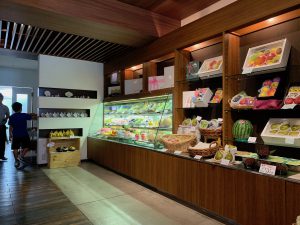 店内はフルーツがたくさん。カフェスペースはさっぱりとシンプルながら落ち着く空間。