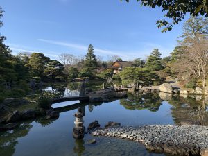 回遊式庭園らしい池。手前にあるのは洲浜と呼ばれ、海岸を表現しています。
